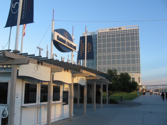 Hilton hotel seen beyond San Diego Harbor Excursion ticket booth.Marriott Hotel as seen from the bayside walkway.Looking north from the silvery Marriott toward the sandy Hyatt.One more look at the two Manchester Grand Hyatt towers.