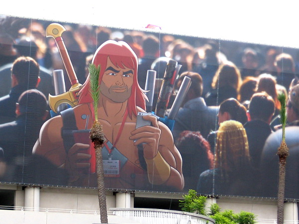 Zorn the friendly warrior has invaded downtown San Diego! This morning I spotted him right next to the convention center! He’s “hanging out” on three enormous banners draping the parking garage of the Hilton San Diego Bayfront!