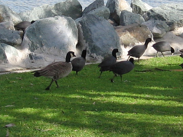 American coots (also called mud hens) stand on rocks near the Marriott Marina.A Canada goose on San Diego’s Embarcadero! Now that’s a very unusual sight! This bird seems to have joined a local flock of American coots. Maybe it was blown off course during the recent windy storm.Another strange bird near the sparkling water about to take flight! Oops. My mistake.A female black-crowned night heron among rocks near the Embarcadero Marina Park South pier.A gathering of pigeons on the grass at Embarcadero Marina Park North.Rare exotic birds photographed in flight! Oops. Those are actually colorful kites. Fooled me again!I’ve arrived at Seaport Village. Okay, I’m certain these are real birds–maybe. Looks like a parrot, flamingo and some egrets.Gulls, pelicans and sea lions await handouts of leftover fish parts. Early Saturday afternoon, and the Tuna Harbor Dockside Market is wrapping up.Two sneaky gulls with hungry, watchful eyes.There’s gotta be some yummy fish scraps here somewhere!Commercial fishermen unload on the small dock behind this gate at Tuna Harbor. Birds wait eternally here, too!A bird in the sky above broad-winged sailboats flying across San Diego Bay.Seabirds love hanging out around the fishing vessels at Tuna Harbor.A snowy egret near the net of a live bait catching seiner.A double-crested cormorant flaps its wings in the water of San Diego Bay near the USS Midway.Birds above an ocean wave, painted on a ceramic tile by a young person. Many fun tile benches along the Embarcadero were created for a project called Celebrating the Big Bay in 2004.Many birds in flight.