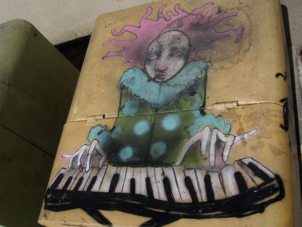 As I continued north on the Coastal Rail Trail, I noticed what appeared to be a crescent moon on the pathway, with a moon poem by Walter de la Mare.A bit farther on I found another glistening moon. This one includes a poem by Emily Dickinson.I then came upon this colorful stained glass sunburst, standing between the pathway and nearby Highway 101!Sunburst of Color, by artist Amber Irwin, 2005. Amber Irwin is a founding member of the Solana Beach Art Association.A small garden beside the Coastal Rail Trail was bright on a late summer day with flowers.An electrical box with painted artwork.Looking over a fence, I saw a Coaster rumbling up the train tracks that run parallel to the trail.Then I stumbled upon a third crescent moon, and a mysterious hat! This poem is also by Emily Dickinson.A water fountain near steps to the Dahlia Drive pedestrian bridge that spans the train tracks. The fountain stands above colorful mosaics.This mosaic is a love gift from the Solana Beach Presbyterian Church.A local youth group made these many cheerful ceramic leaves and flowers.Across the train track I spotted the huge, eye-catching mural by artist Lindu Prasekti. It’s titled Myths at Play.