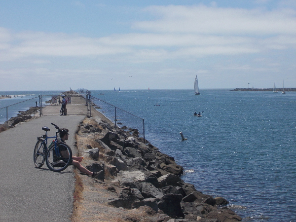 Loving the fresh air, I walked out onto the narrow jetty at Hospitality Point. To my left, beyond the San Diego River, I saw families and their playful dogs at Ocean Beach. To the right, I saw sailboats navigating out of the Mission Bay channel toward the Pacific Ocean. A couple was paddling kayaks nearby. Several guys were fishing from the rocks. Bicyclists also headed down the jetty.