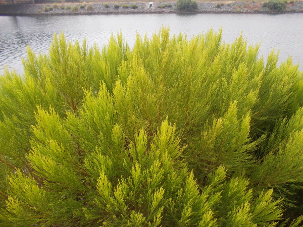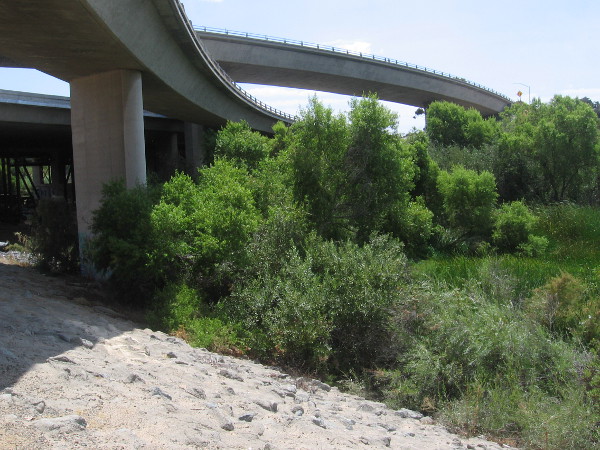 The rocky-sided river channel, as seen looking down from Interstate 5, appears almost barren, but when you walk along the bike path you notice many plants among the broken rocks, and the ones that are deep-rooted were very green in the summer sunlight.