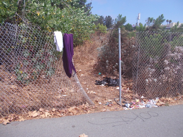 During the day bicyclists and runners passed me by as I slowly walked, and the nearby busy westbound lanes of U.S. Route 54 sometimes came into view. But late at night, the scene is obviously very different. There was graffiti which increased as I progressed east to Interstate 805. There was trash and frequent evidence of homelessness. As I came into the vicinity of Interstate 805, I passed several active homeless encampments. And the graffiti spoke of gang activity, with references to drugs and death.