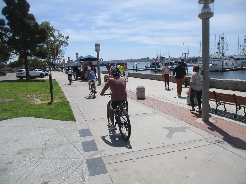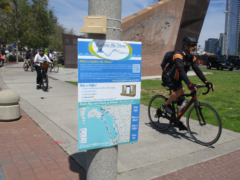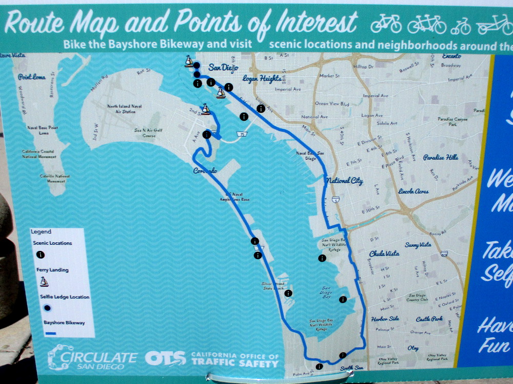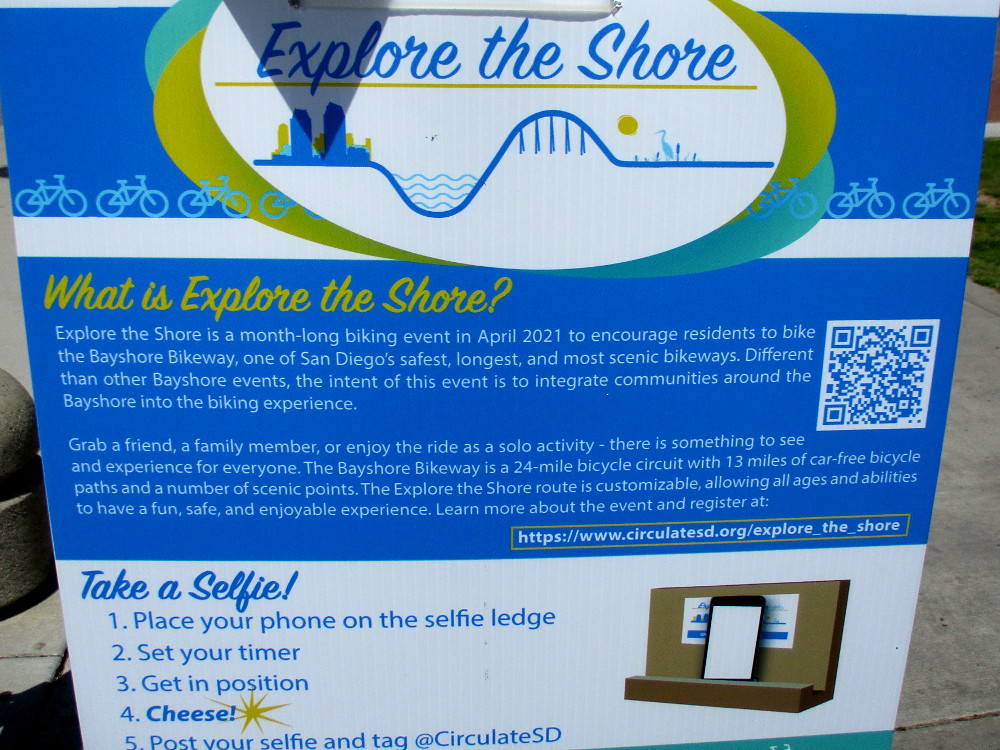 Residents are being urged by Circulate San Diego to bike the Bayshore Bikeway, which circles San Diego Bay. The sign explains: “The Bayshore Bikeway is a 24-mile bicycle circuit with 13 miles of car-free bicycle paths and a number of scenic points.”