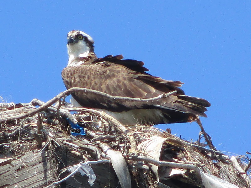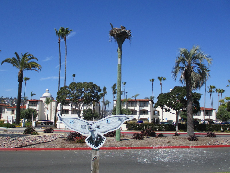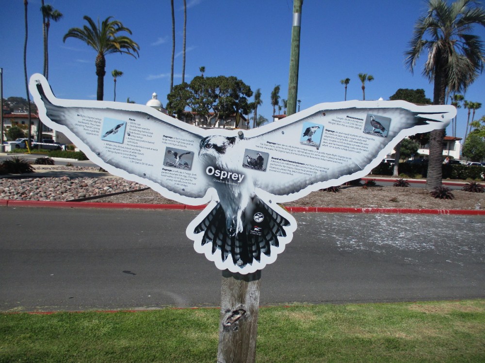 Ospreys are year-round residents of San Diego Bay. This medium-large raptor is particularly well adapted to diving for fish, with reversible outer toes, closable nostrils to keep out water during dives, and backwards facing scale on the talons which act as barbs to help hold its catch.