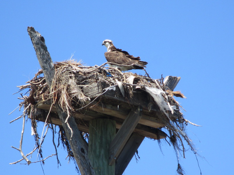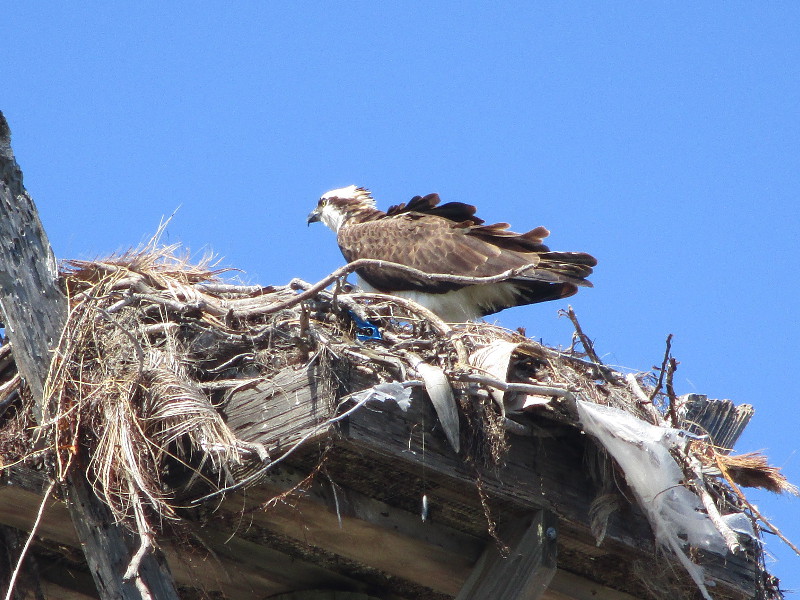 A sign across the street from the high nest-supporting platform provides interesting facts concerning the Osprey (Pandion haliaetus) and its nest. Included: