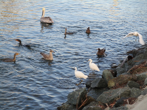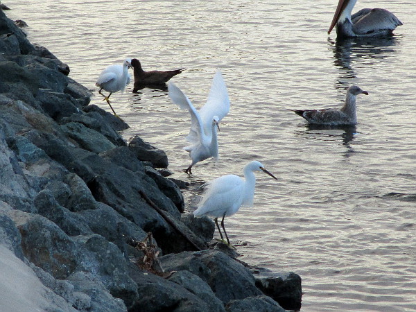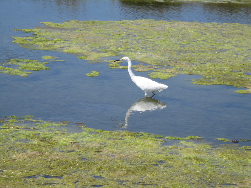 During this walk I saw several Snowy Egrets, a cormorant at a distance, and quick little birds flying shrub to shrub that I couldn’t identify. I also saw a brown pelican and great blue heron flying overhead.