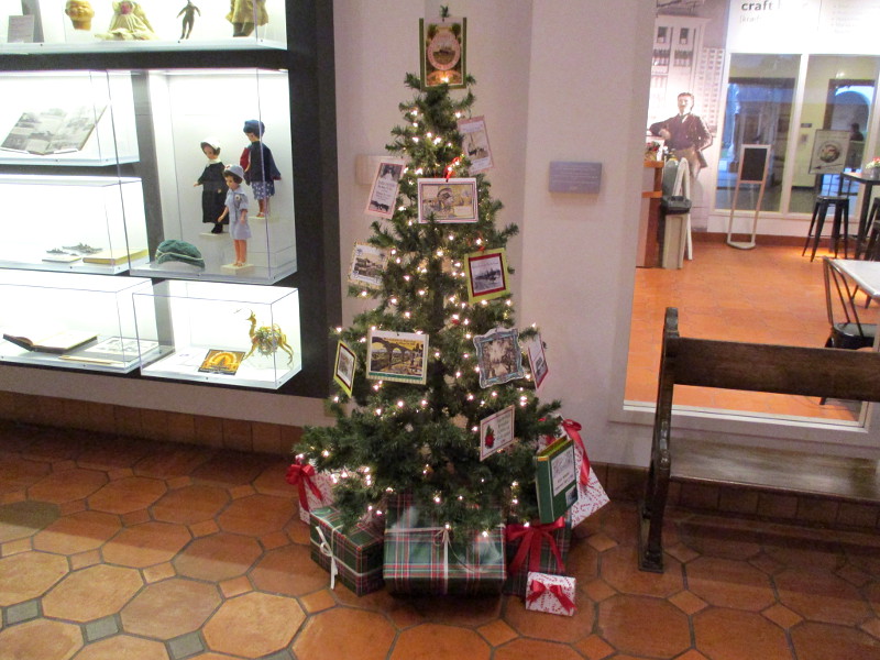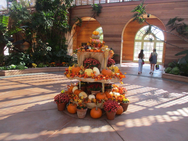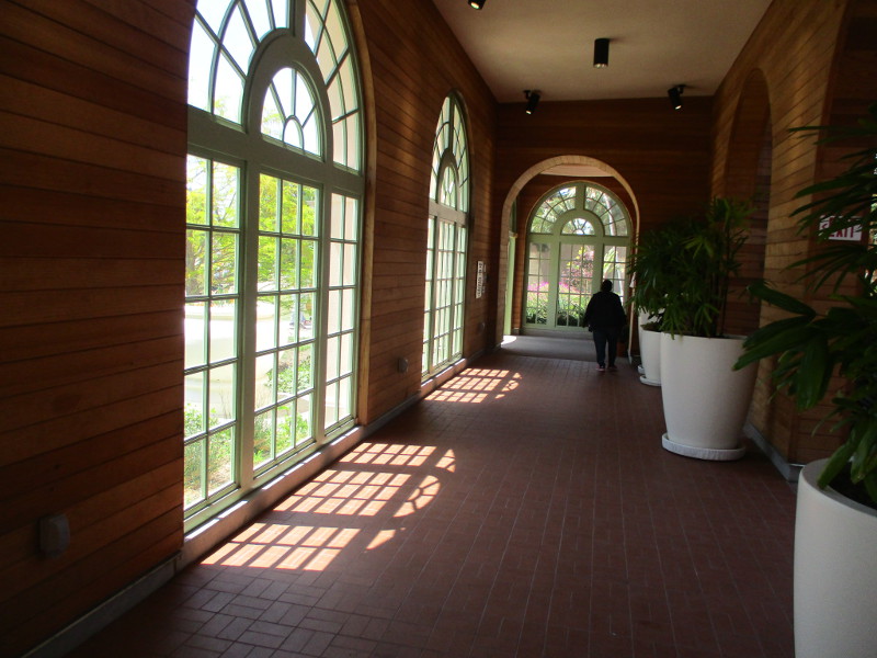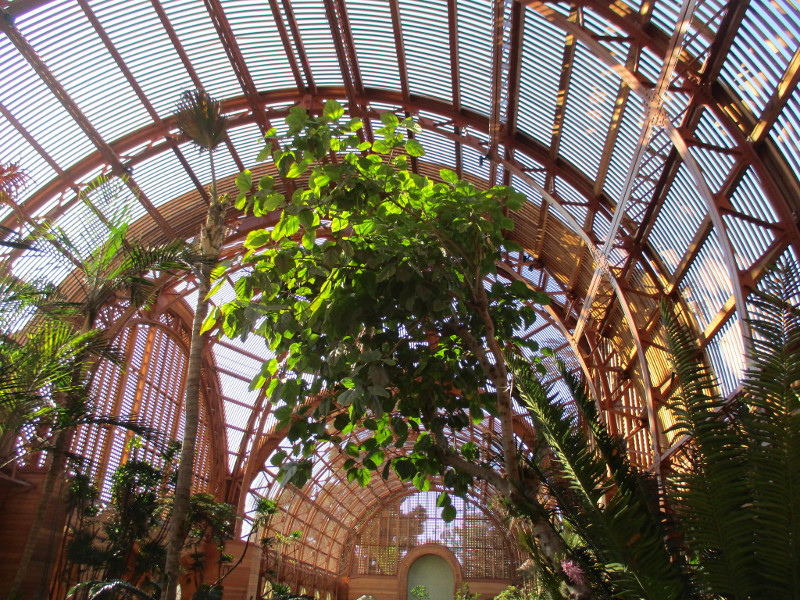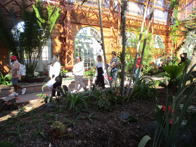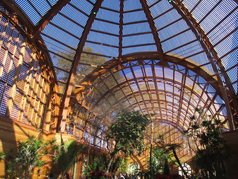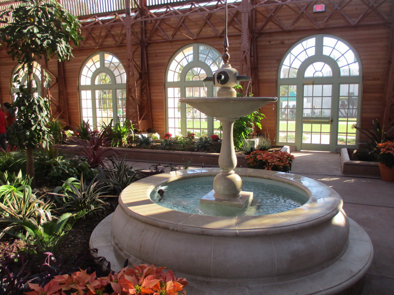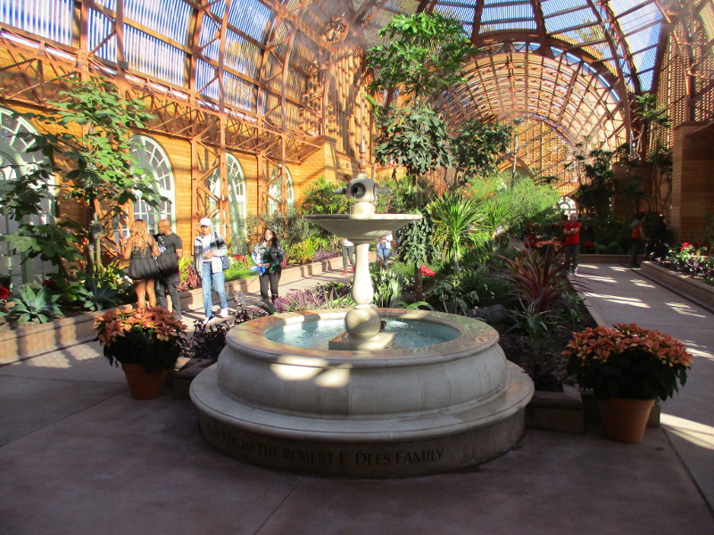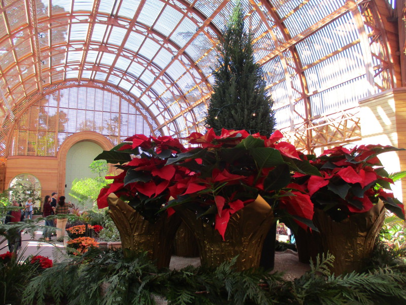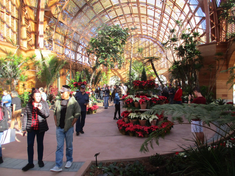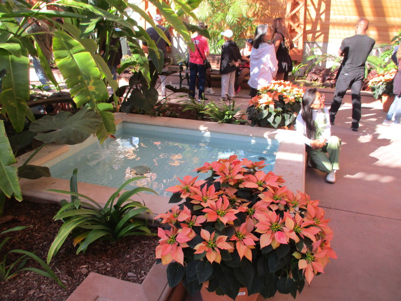 There are poinsettia displays at the center of the Botanical Building, beside the fountains at either end, along windows, and here and there planted in the surrounding lush greenery.