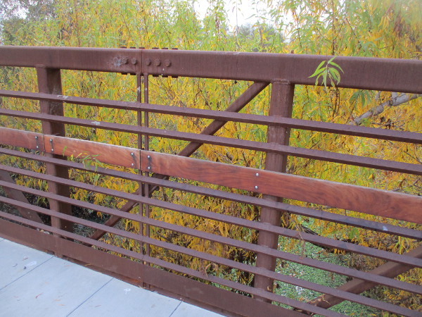 After checking out the corner of the park next to the trolley station, I walked east following the elevated trolley tracks, turned south, passed an unfinished information kiosk, and crossed the San Diego River via the pedestrian bridge. I then walked along the winding new path on the south side of the river.