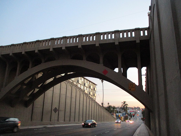 According to this page of the City of San Diego Digital Archives: The Georgia Street Bridge was built in 1914 in one of the city’s earliest suburbs, crossing over busy University Avenue where streetcars once traveled. The bridge’s basic design is Romanesque Spandrel Arch with Mission Revival styling. It was listed on the National Register of Historic Places in 1998. The bridge recently completed a major renovation that included seismic and structural retrofitting.
