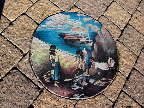 A bronze sculpture of a tuna fishermen holding his catch. Piazza Pescatore was donated by Bumble Bee Seafoods, which is headquartered in San Diego.A plaque honors the men and women of the tuna industry who helped build San Diego’s Little Italy.More plaques at Piazza Pescatore honor those who made San Diego the tuna capital of the world during much of the 20th century.A colorful circle of artwork on the nearby sidewalk shows women with baskets and bountiful fresh fish.