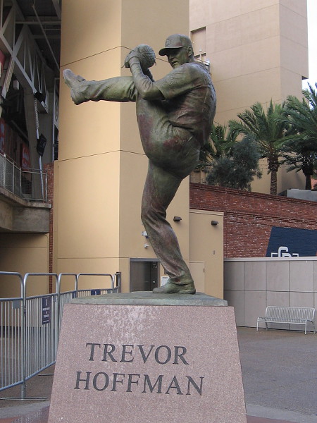 A sculpture of Trevor Hoffman overlooks the Padres bullpen, just beyond left field at Petco Park.There is no shortcut to true success. Trevor Hoffman.The high leg kick of Hall of Fame relief pitcher Trevor Hoffman immortalized in bronze.Two legends of baseball now intersect at Tony Gwynn Drive and Trevor Hoffman Way, just outside Petco Park.The bronze sculpture of legendary pitcher Trevor Hoffman, by artist William Behrends.