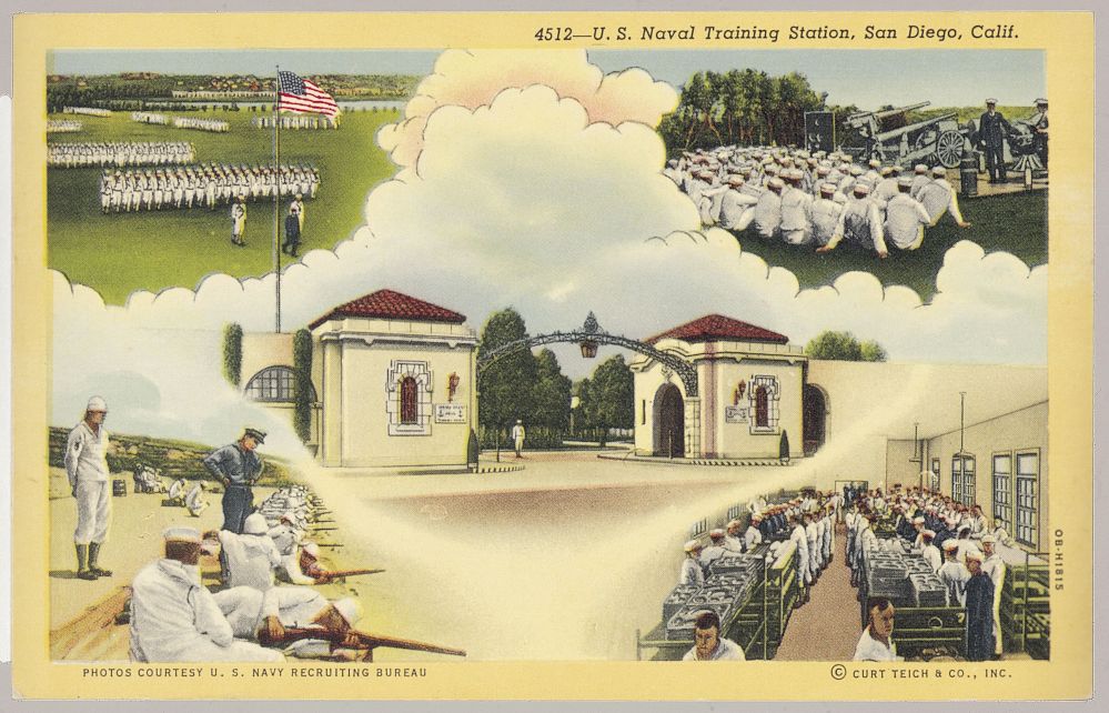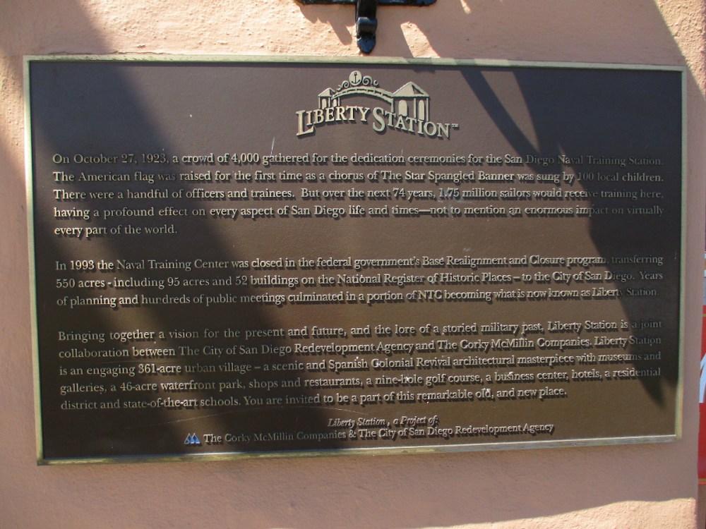 The plaques summarize the history of the San Diego Naval Training Station, which opened in 1923 and was finally decommissioned in 1997. Over 1.75 million sailor recruits would receive training here.