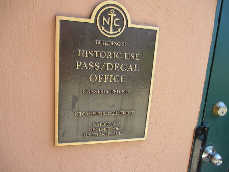 A plaque by the door of Building 21 identifies it as the Pass/Decal Office, constructed 1922.