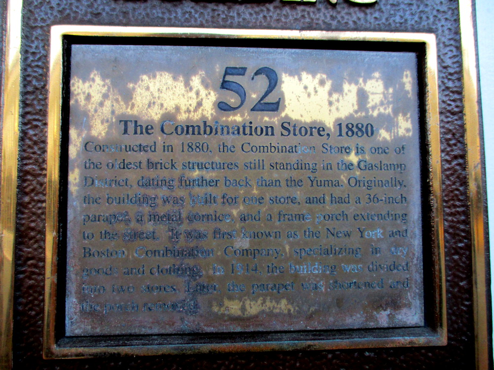 Constructed in 1880, the Combination Store is one of the oldest brick structures still standing in the Gaslamp District, dating further back than the Yuma. Originally, the building was built for one store, and had a 35-inch parapet, a metal cornice, and a frame porch extending to the street. It was first known as the New York and Boston Combination Company, specializing in dry goods and clothing. In 1914, the building was divided into two stores. Later, the parapet was shortened and the porch removed.