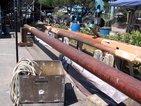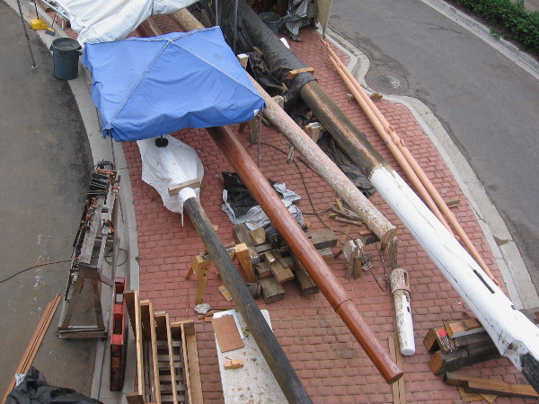 Wood mast segments and yards are coasted with linseed oil, I believe. They’ll be installed once the ship is afloat in San Diego Bay.