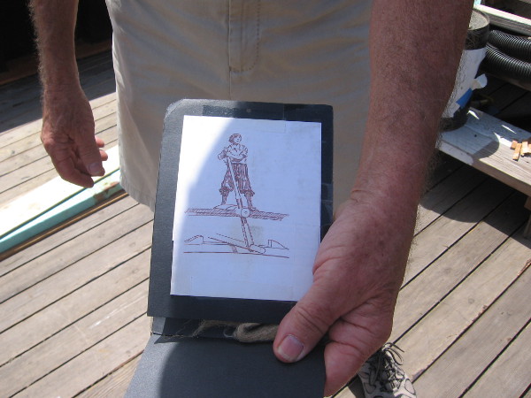 Sketch of helmsman steering the galleon with a vertical lever attached to the rudder’s tiller. He had a window to look through in the aftcastle.