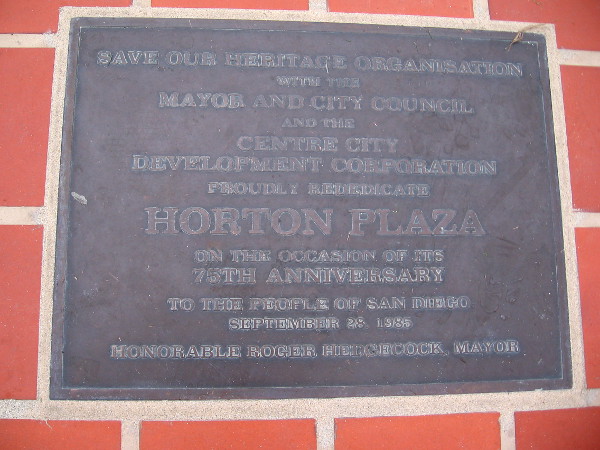 One plaque, dated 1985, in the walkway at the north entrance to the park. It was laid down to mark Horton Plaza’s 75th anniversary.