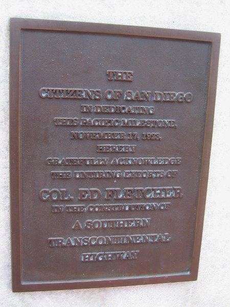 The citizens of San Diego in dedicating this Pacific Milestone, November 17, 1923, hereby gratefully acknowledge the untiring efforts of Col. Ed Fletcher in the construction of a Southern Transcontinental Highway.