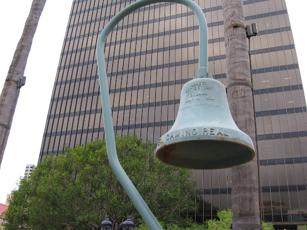 A familiar El Camino Real bell in Horton Plaza Park. It was donated by the San Diego Woman’s Club.