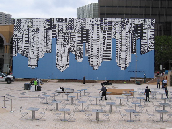 People who enjoy a morning coffee can sit at tables above Horton Plaza Park’s outdoor amphitheater. A cool new mural serves as a distinctive urban backdrop.