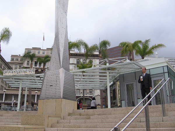 The morning after San Diego’s amazing new Horton Plaza Park has opened. History is being made, and one gentleman takes it all in.