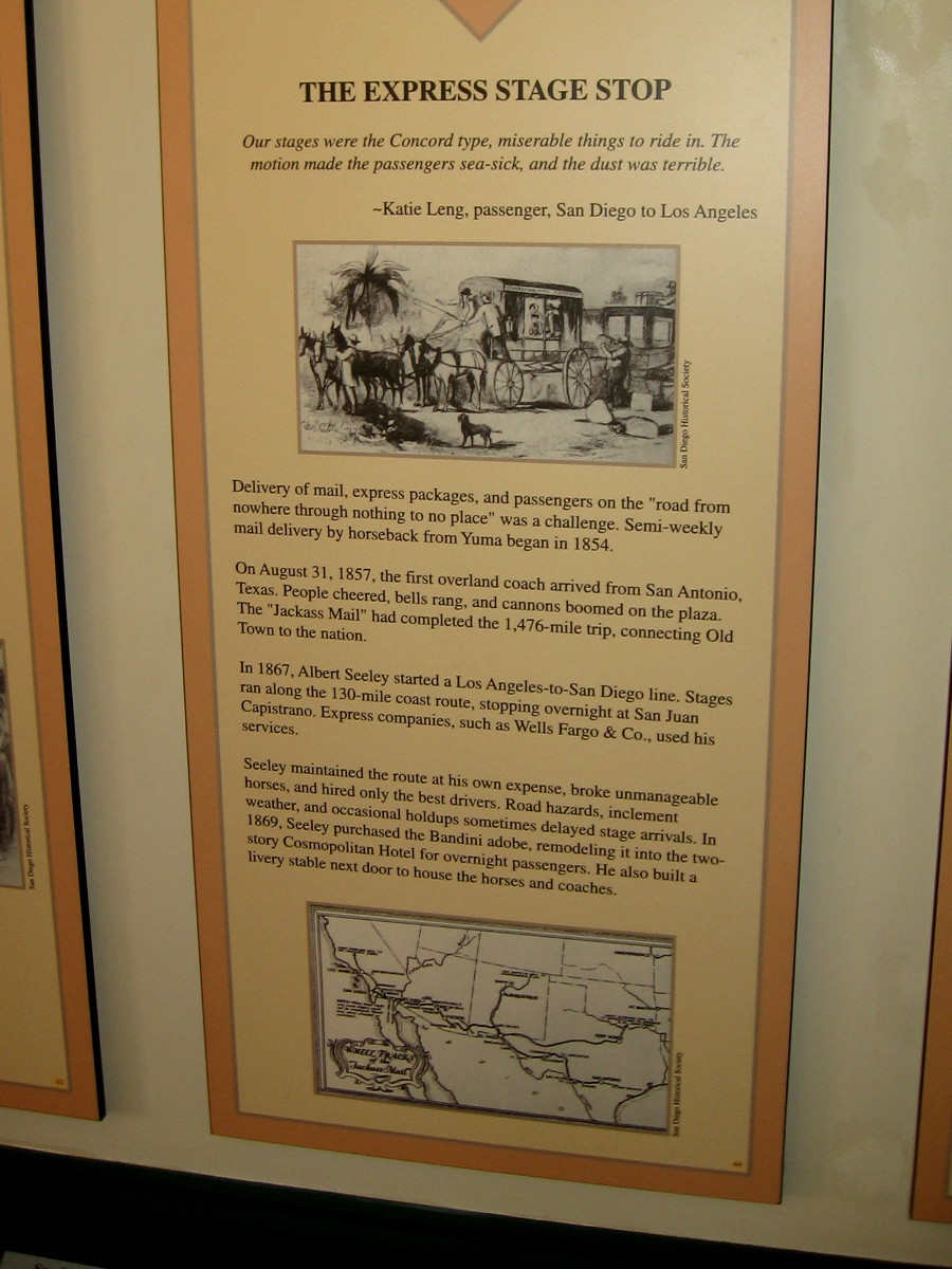 The first overland coach to San Diego began service in 1854. Additional stage lines came into existence, allowing for the delivery of mail, express packages and passengers.