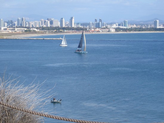And I was rewarded with this view. Having lived in San Diego a good many years, I recognized the large sailboat leaving San Diego Bay. It’s the Abracadabra, a boat used in a past America’s Cup. I also spotted the Stars and Stripes, just out of this picture.