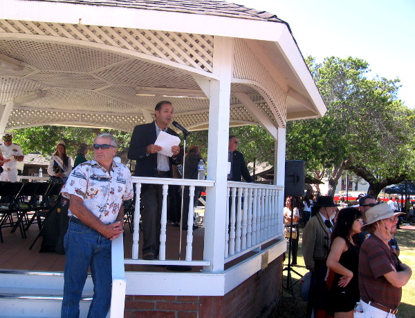 At eleven o’clock, a mock air raid was staged! An aircraft from nearby Naval Air Station North Island swept over the bluffs as World War II veterans and enthusiasts looked on from the hilltop near some old bunkers.