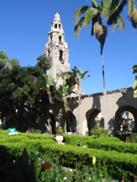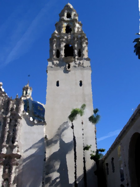 I’ve taken so many photos of the California Tower over the years, from different angles and during different occasions, that I thought I might have a little fun. Using the GIMP graphic software’s Oilify filter, I’ve transformed some of my images into digital oil paintings!