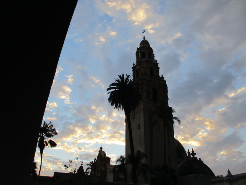 This morning I walked from downtown up to Balboa Park to see the tower just before sunrise. The California Building’s elaborate facade was illuminated with soft purple light, and a golden Museum of Us was splashed upon the tower. The Museum of Us is the new name for the Museum of Man, which occupies the iconic building that was built for the 1915 Panama-California Exposition.