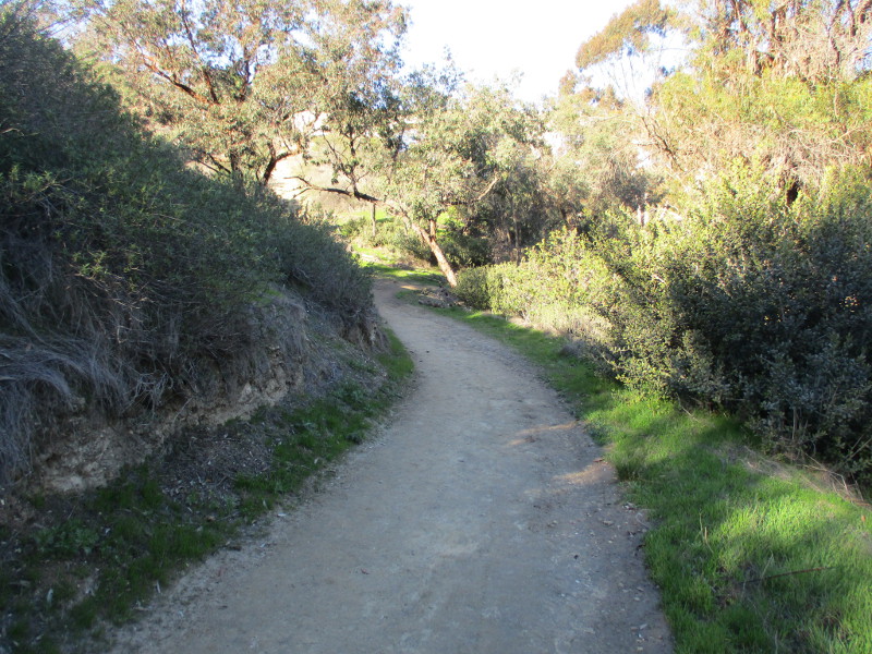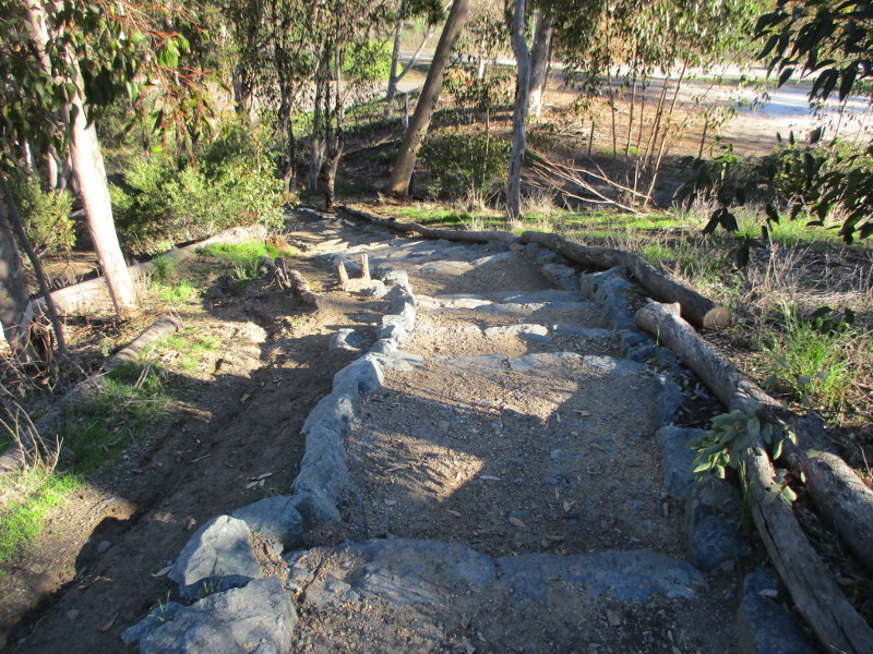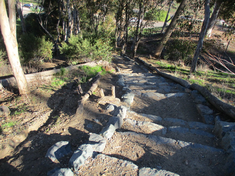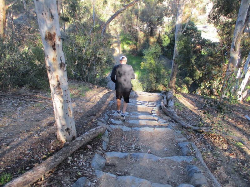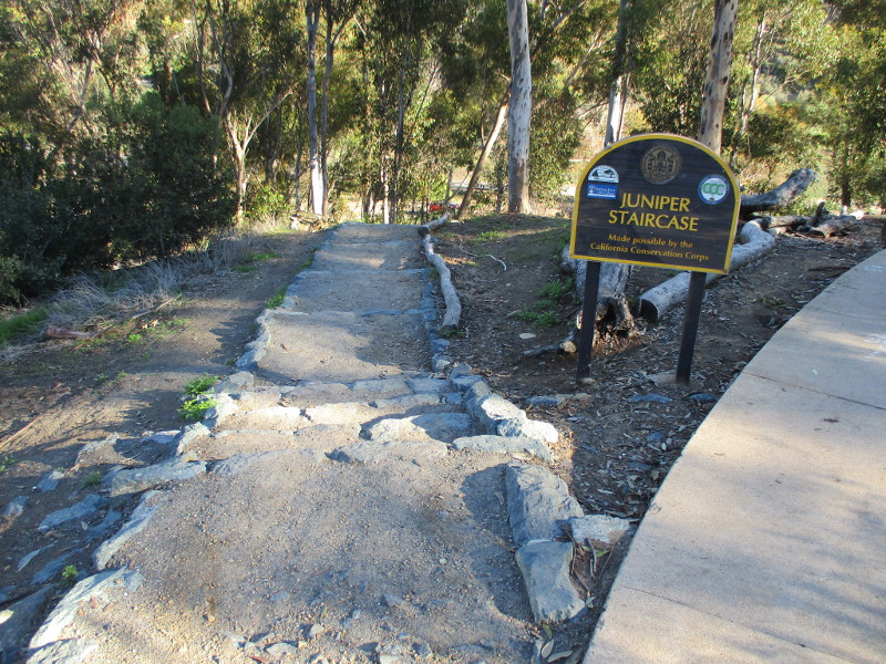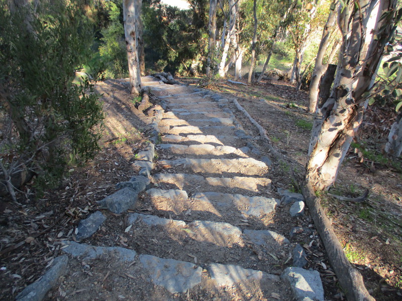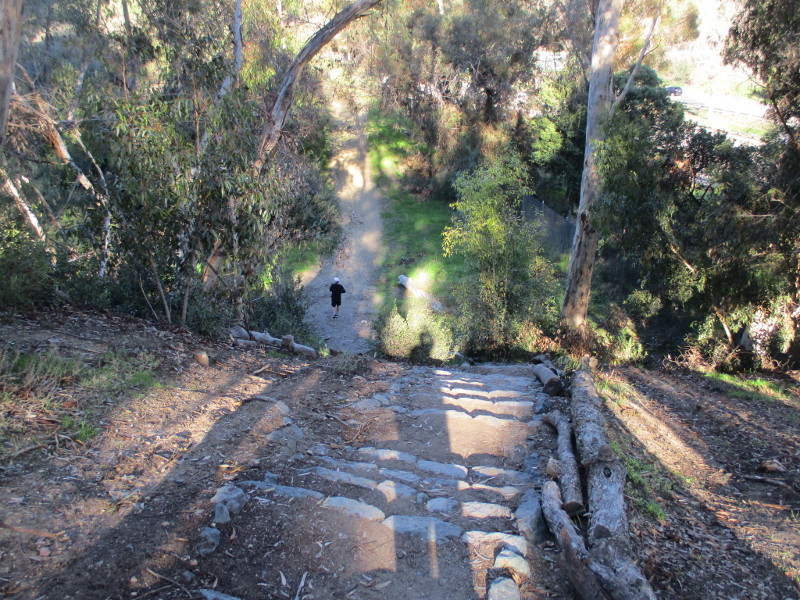 Ninety eight stone steps that were built by the California Conservation Corps descend from a paved pathway that winds through trees on Balboa Park’s West Mesa. Google Maps refers to the several paths in Cabrillo Canyon as Bridle Trail.