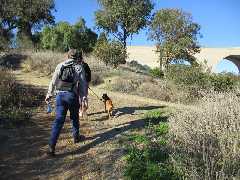 I took these photographs walking down the rocky steps. I continued north along the dirt trail by the freeway and passed the place where one can turn to walk under the historic Cabrillo Bridge. I then completed this relatively short and easy hike at Nate’s Point Dog Park, on El Prado, just west of the bridge.