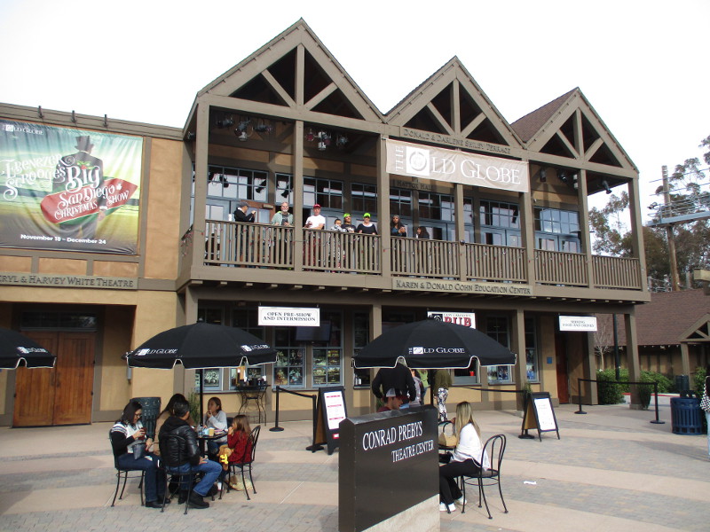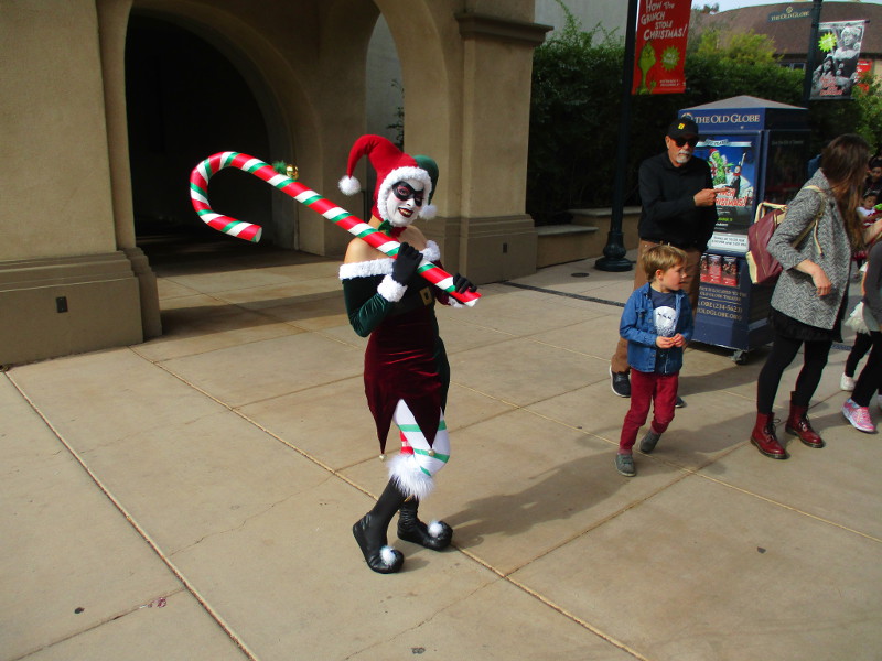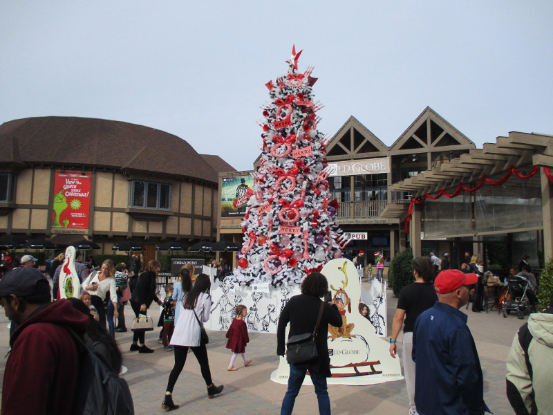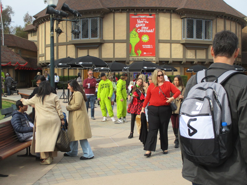 An audience collected near The Old Globe’s Grinch tree. Young and old listened or sang as they chose. It’s beginning to sound a lot like Christmas!