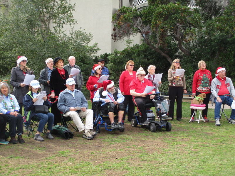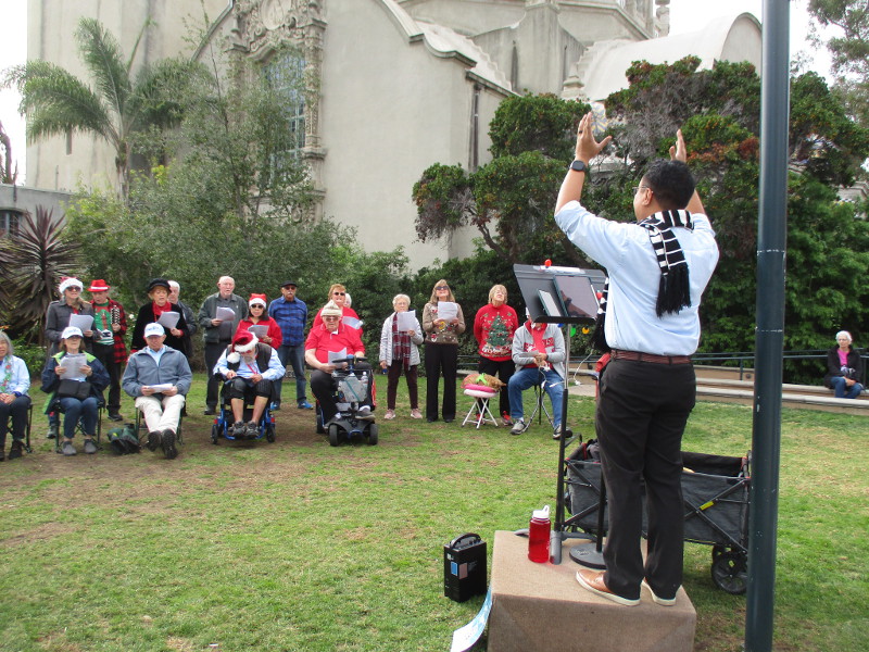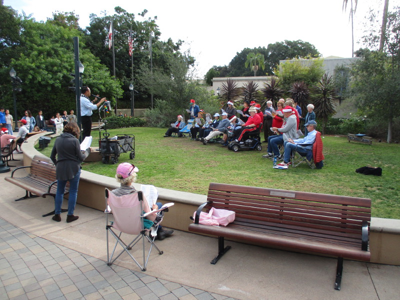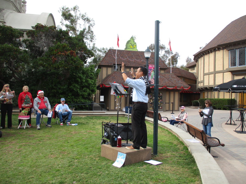 Two dozen Christmas carols were sung early this afternoon near The Old Globe, accompanied by Balboa Park’s carillon!
