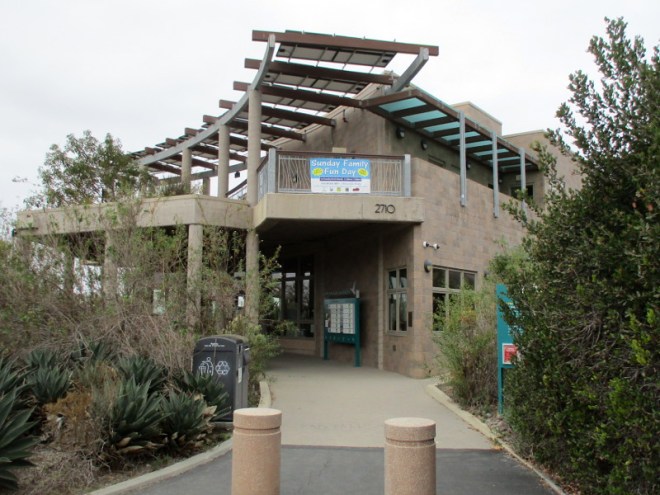 Approaching the Nature Center from the parking lot.Board near front door announces Arrivals and Landings of resident and visiting birds.Many informative exhibits greet visitors inside the Nature Center.Coyote stands atop map of the watershed. Pollutants including trash threaten wildlife that depends on this habitat.An explanation of San Elijo Lagoon’s biodiversity. I don’t think I’ve ever seen a Silvery Legless Lizard.Piece of sandstone from Annie’s Canyon Trail in San Elijo Lagoon.Outside light from the sunlit world touches the light of learning.
