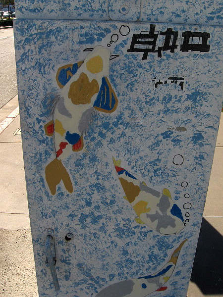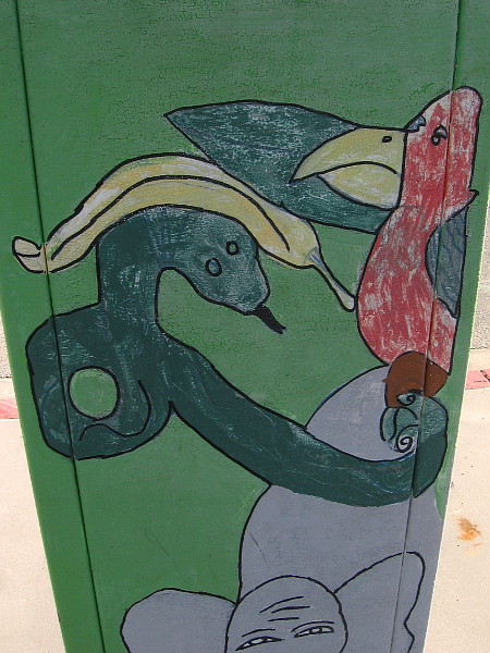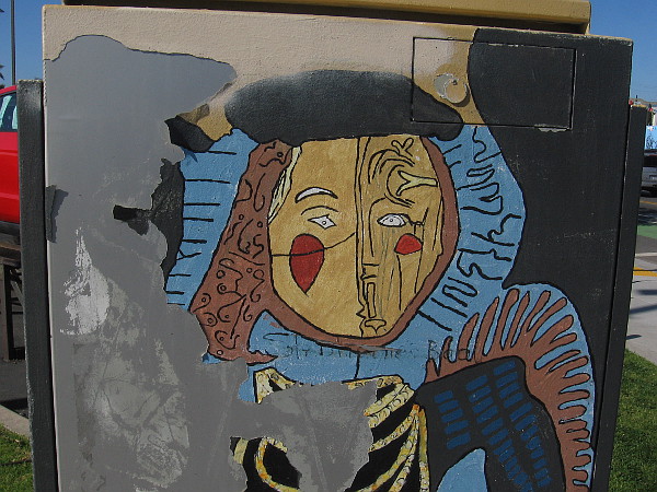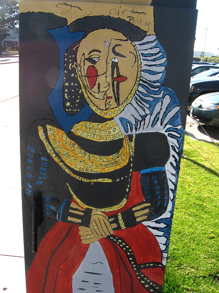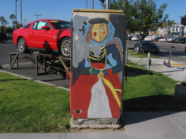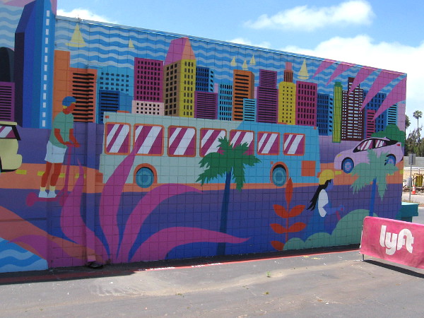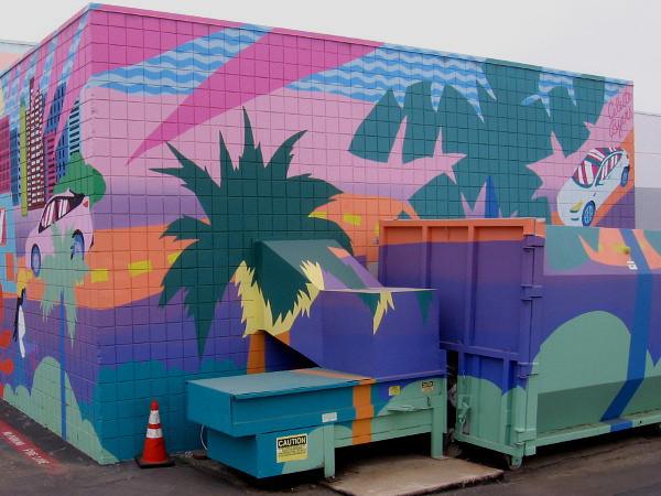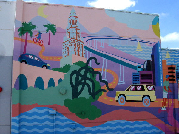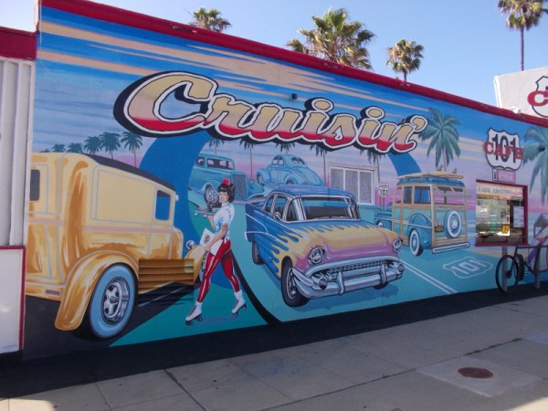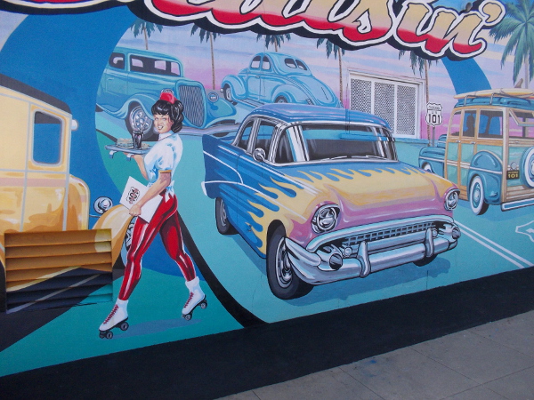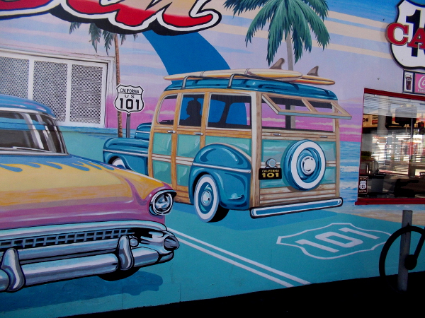 If you love cool cars and nostalgia you’ll like this mural. It’s painted on the south side of 101 Cafe in Oceanside. The mural depicts a carhop outside wearing roller skates. She’s serving food to customers in a woodie, hot rod and several other classic cars.