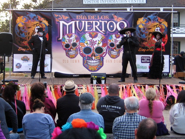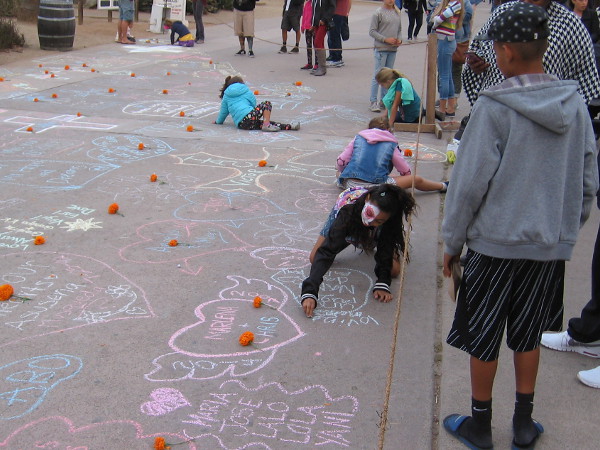 An abundance of music, humor and life on stage during the Dia de los Muertos celebration in Old Town San Diego!People could pose for photos with two giant skeleton puppets!An artist paints two large skulls–calaveras–in Old Town’s Plaza de las Armas during Dia de los Muertos.Children decorate traditional sugar skulls.Some around the park wore fancy dresses and hats for the day, recreating the iconic Mexican image of La Calavera Catrina. I saw many faces painted like fantastic skulls.Some of the shops in Old Town had a mix of decorations for both Halloween and Dia de los Muertos.A large, colorful calavera above a restaurant inside Old Town San Diego State Historic Park.Face painting and a youthful smile.Hundreds of tributes and sentiments for departed loved ones were written in chalk on a long stretch of San Diego Avenue, inside Old Town San Diego State Historic Park.Lanterns among the many Dia de los Muertos chalk memorials.Te amo–I love you–and a marigold.Love and memory connect many generations as the years roll on.