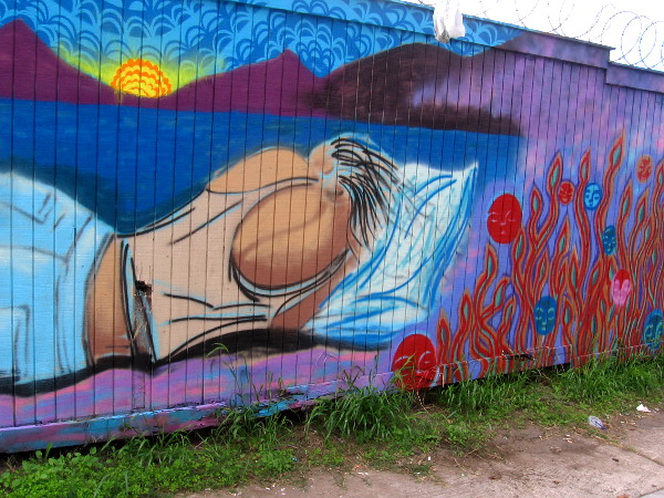 I believe the mural, which appears to depict a dream full of symbolism, was recently created by Jessica Petrikowski, a Chicana artist in San Diego.