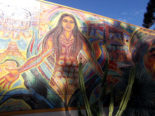 Click the photo of the plaque and you can read an explanation of the different images contained in the mosaic. The two boldest, which immediately draw your attention, are the Corn Goddess near the center representing Mother Earth, and the large face of civil rights activist Cesar Chavez.