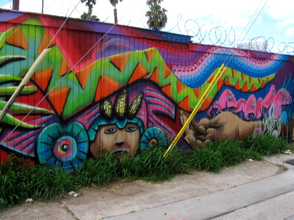 A mural titled Cosmic Train of Wisdom, painted in 1989 by local Chicano artist Mario Torero and students from O’Farrell High School of Performing Arts and Roosevelt Junior High School, decorates the back side of a building located on the northwest corner of Park and El Cajon Boulevard.