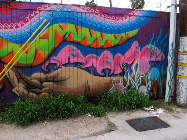 I walked behind the building yesterday and took the following photographs of the large, nearly 30 year old mural, to help preserve a little bit of San Diego history…