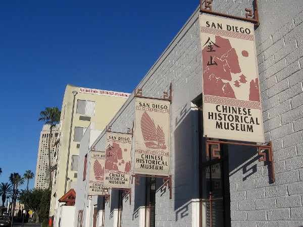 The San Diego Chinese Historical Museum in the Asian Pacific Thematic Historic District. The Chinese Mission Building, built in 1927, was moved in 1995 to its present location at 404 3rd Avenue.The California Mission Revival-style Chinese Mission Building, dated 1927, was designed by Louis Gill, nephew and protege of renowned architect Irving Gill.Banners along side of downtown’s San Diego Chinese Historical Museum.Looking through the Dr. Sun Yat-Sen Memorial Gate on Third Avenue. Behind the museum is a small Asian garden.Ornate front of the San Diego Chinese Center, a community resource located in the Asian Pacific Thematic Historic District.A century ago, Quin Produce was located here on Third Avenue. Ah Quin ran a family produce business and was once considered the unofficial mayor of Chinatown.The Chuang Archive and Learning Center of the San Diego Chinese Historical Museum.Display in window explains Feathered Beings Iconography. Feathered beings were frequently seen motifs in artifacts of the Han Dynasty.Three bay windows at the Dr. Sun Yat-sen Memorial Extension display historical photographs and common artifacts from San Diego’s old Chinatown.Photographs in this outdoor exhibit show various aspects of Chinese culture.A view of San Diego’s Third Avenue a hundred years ago, and the family of influential businessman and civic leader Ah Quin.Items from daily life in old Chinatown include kerosene heater, iron, and a grocery scale.Scale manufactured by National Store Specialty Company, circa early 1900s.Display includes various articles used for food preparation and cooking in San Diego’s old Chinatown.Beautiful, artistic and historically interesting objects from daily life long ago in Chinatown.A walk through San Diego’s Asian Pacific Thematic Historic District provides many cool sights!