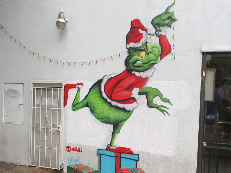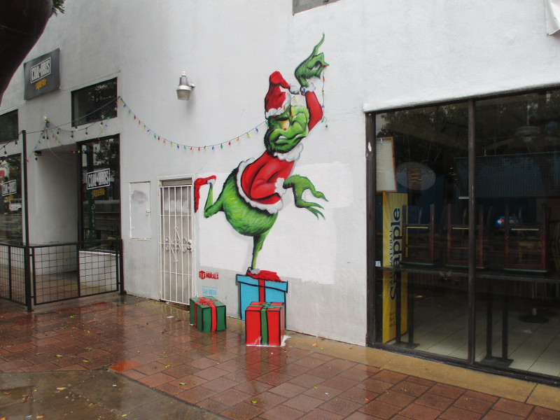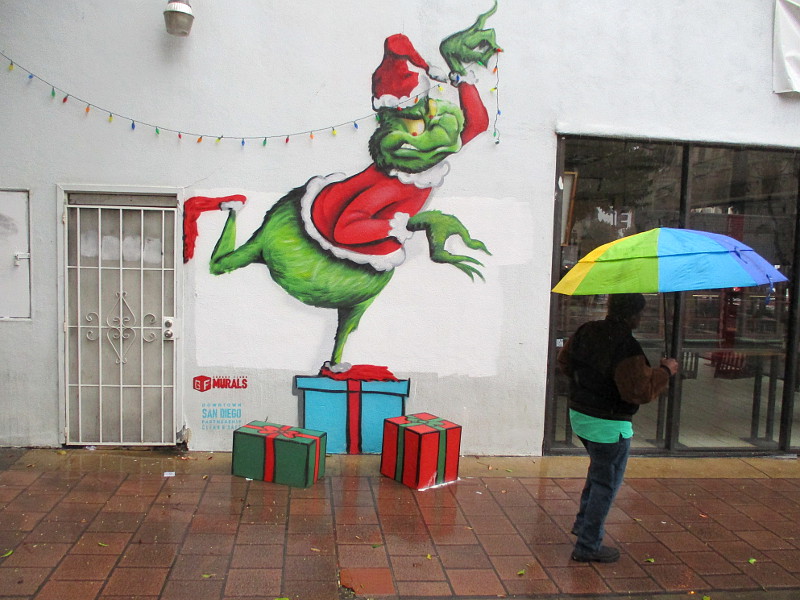 The green grumpy Grinch was spotted in the rain this morning stringing Christmas lights in downtown San Diego! Riders of the trolley had to look twice as they rolled down C Street between Brooklyn Pizzeria and Coal Bros Taqueria!