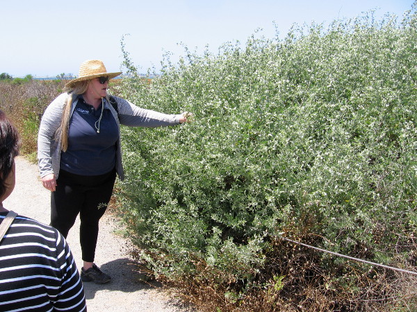 A map inside the nearby Living Coast Discovery Center shows the location of the Sweetwater River and the marsh where it enters San Diego Bay.Hiking through Chula Vista’s protected Sweetwater Marsh on a sunny day. It’s mid-May and the once green and flowering plants have begun to dry out. In this photo I see some prickly pear cactus. During the hike I also recognized black sage and coastal sagebrush.Our guide shows us saltbush. It is adapted to the type of salty soil in this coastal marsh. Its leaves taste salty!Sign by the trail. This area is called Gunpowder Point. During World War I, Hercules Powder Co. extracted potash and acetone here from kelp harvested offshore in the Pacific Ocean. These were used to make cordite, also called smokeless gunpowder, for the British.A sail on the bay beyond a drying field of San Diego Sunflowers.The short, easy hike is ideal for families.Some sunflowers are still yellow.The San Diego Sunflower, or Bahiopsis laciniata, is often found in a coastal sage scrub environment.The Silver Strand and Coronado Cays can be seen across San Diego Bay.We’ve arrived at the wildlife refuge’s narrow sandy shore. Birds could be seen here and there in the distance.As the group continues on, I linger to take in the sunshine and wide views. I notice what appears to be remnants of the potash manufacturing operation from years ago. Some benches allow rest and meditation.Stones and debris on a beach in the wildlife refuge.Some mysterious (to me) concrete ruins on Gunpowder Point.I arrived at a bird observation structure. All was very quiet. I saw a California least tern hunting small fish along the water’s edge. Few people seem to come out here.Depending on the tide, the area near the shore can be open water or a mudflat that supports shorebirds searching for food.Bird’s beaks are specially designed for feeding. Some beaks filter plants from the water, some grab flies out of the air, and some probe the mud.The tide must have been out, because this platform stood above a drying mudflat. I believe that might be bright green eelgrass in the shallow pool of water.Mesembryanthemum crystallinum, or crystalline ice plant, is salt tolerant. My hike through the marsh produced some beautiful surprises.Hiking through an expanse of green in San Diego’s South Bay.