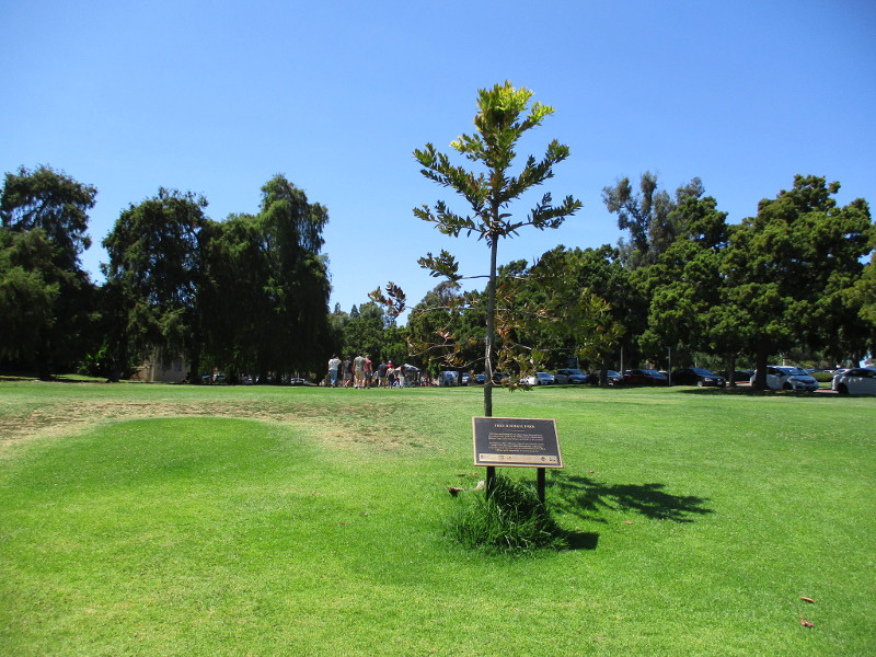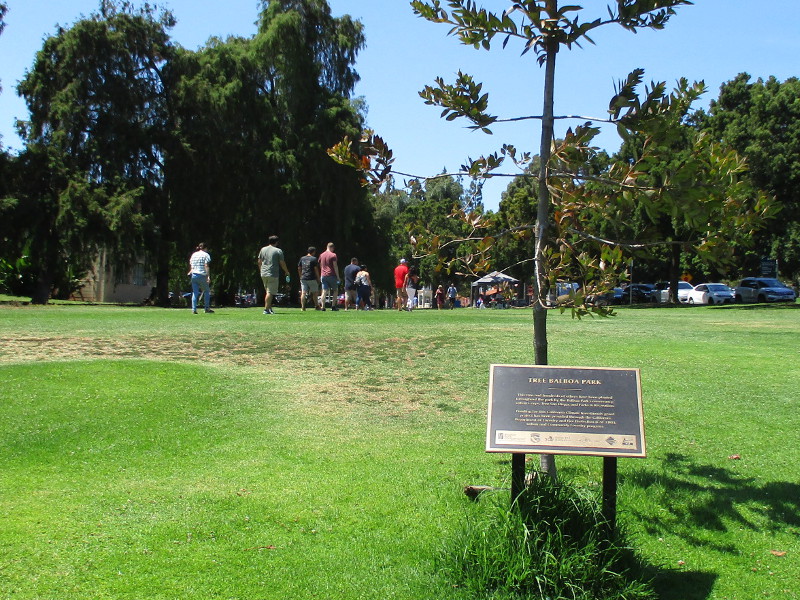 I was walking through Balboa Park on Sunday, making my way toward Park Boulevard, when I noticed a newly planted tree with a shiny plaque beside it.