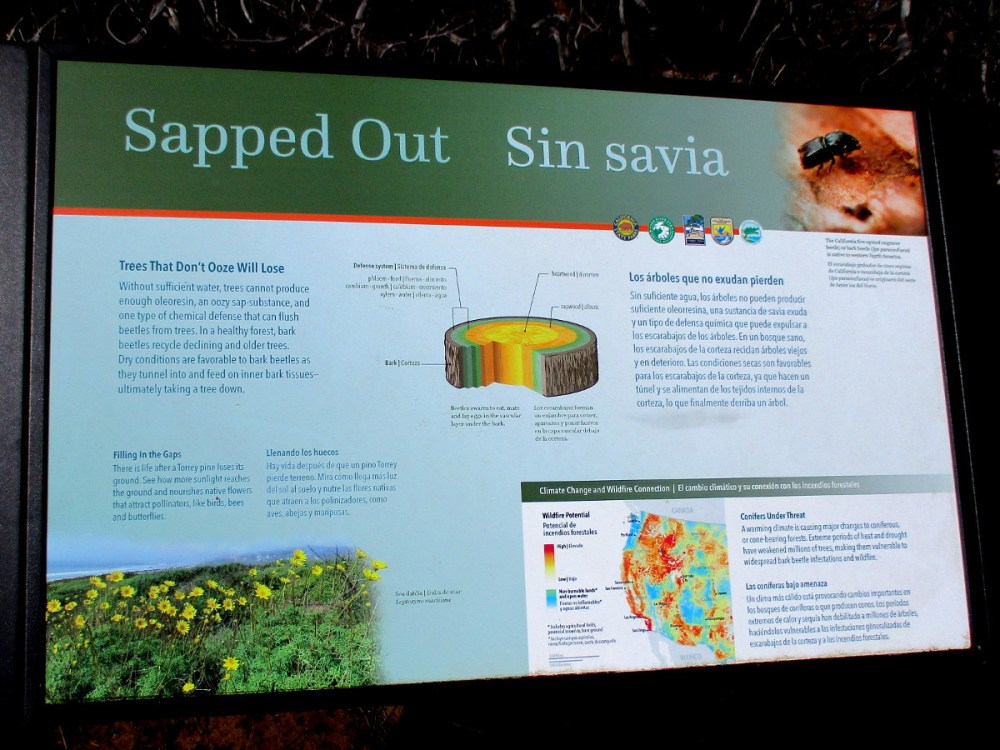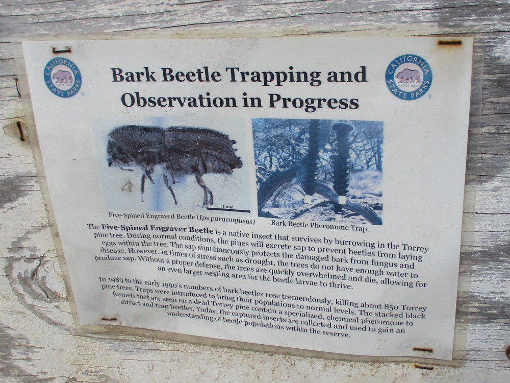 As I walked along, observing all those blue tubes, I paused to read signs that explain how bark beetles kill the rare and beautiful Torrey pine. This tree’s natural protection against beetle infestation is sap. During drought trees produce less sap than usual and become especially vulnerable.