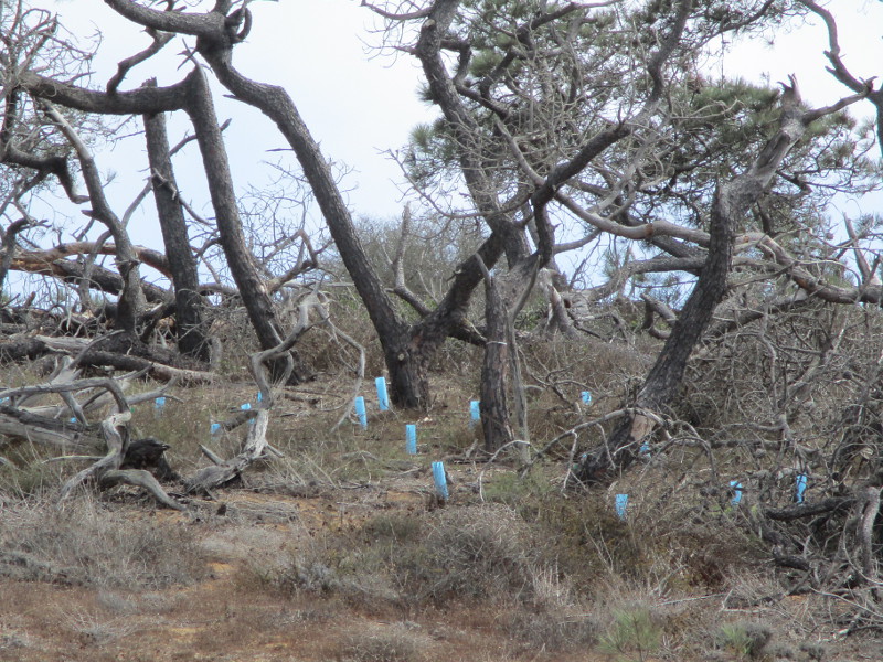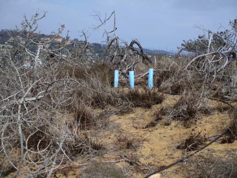 I walked the loop of the Guy Fleming Trail yesterday, where visitors can see many of the dead Torrey pines. Among dead trees, clustered close to the ground, stand strange blue tubes. These plastic protectors shield growing trees and other plants from animals and drying winds.