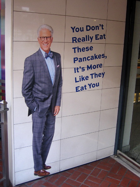 You don’t really eat these pancakes, it’s more like they eat you. A funny The Good Place quote at the door of Maryjane’s restaurant during 2019 Comic-Con.