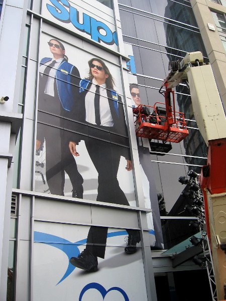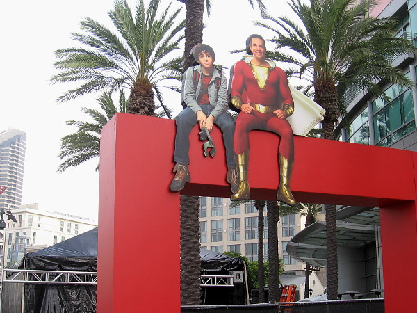 Wraps are being placed on the Hard Rock Hotel promoting NBC’s The Good Place and Superstore for Comic-Con.A wrap on the building’s south side shows characters from NBC’s Superstore. Comedy Starts Here.Putting on the fun building wrap, with two days until the start of Comic-Con.Superstore graphics now decorate the lobby of the Hard Rock Hotel in San Diego.Across Fifth Avenue, the Amazon wraps are done. This one promotes The Boys. That’s one smiling superhero I’d prefer to avoid.Other stuff is springing up around downtown, like this somewhat goofy-looking banner on a building advertising Tik Tok.Businesses in the Gaslamp Quarter are jumping on the Comic-Con bandwagon. Game of Thrones and Stan Lee inspired cocktails?Syfy has moved to Seventh and J Street for 2019 Comic-Con. I believe you can catch their fun karaoke bus and trivia trolleys here.A cool Star Trek: Discovery wrap is being applied to the north side of the Omni Hotel.The Warner Brothers offsite has erected an archway that says Chilladelphia Winter Carnival. You might remember the big, climactic scene in Shazam!Freddy Freeman and his pal Shazam are perched atop another arch!
